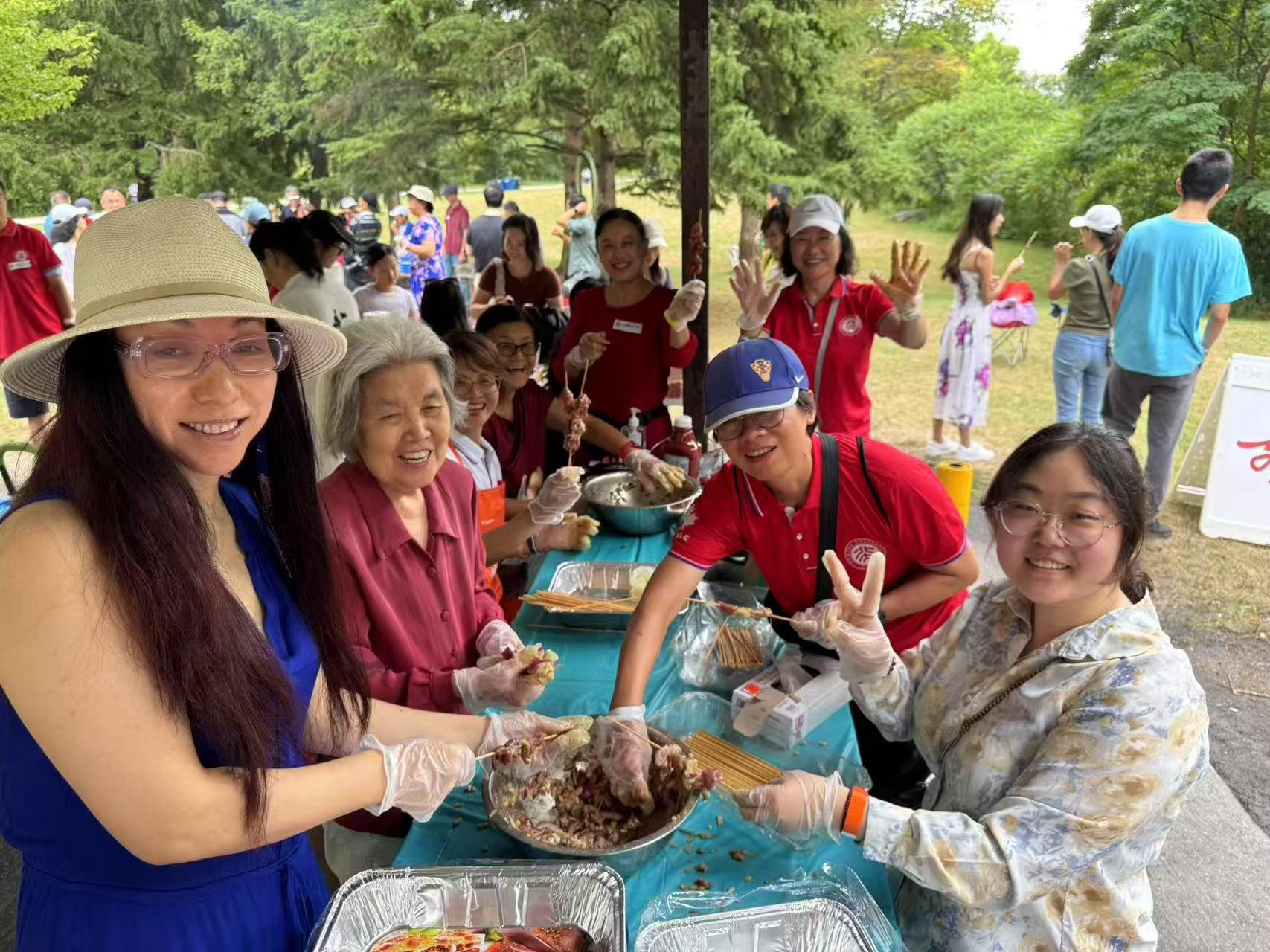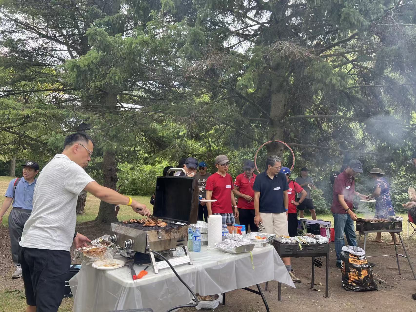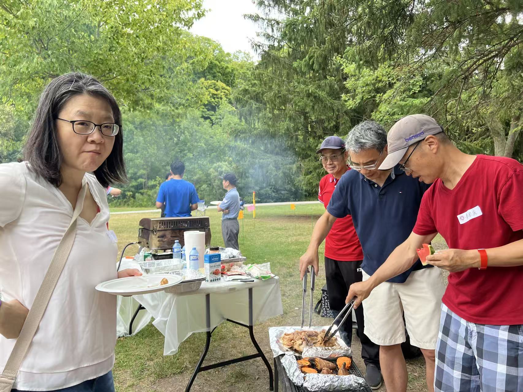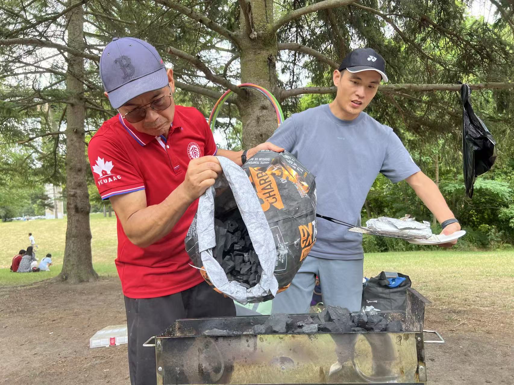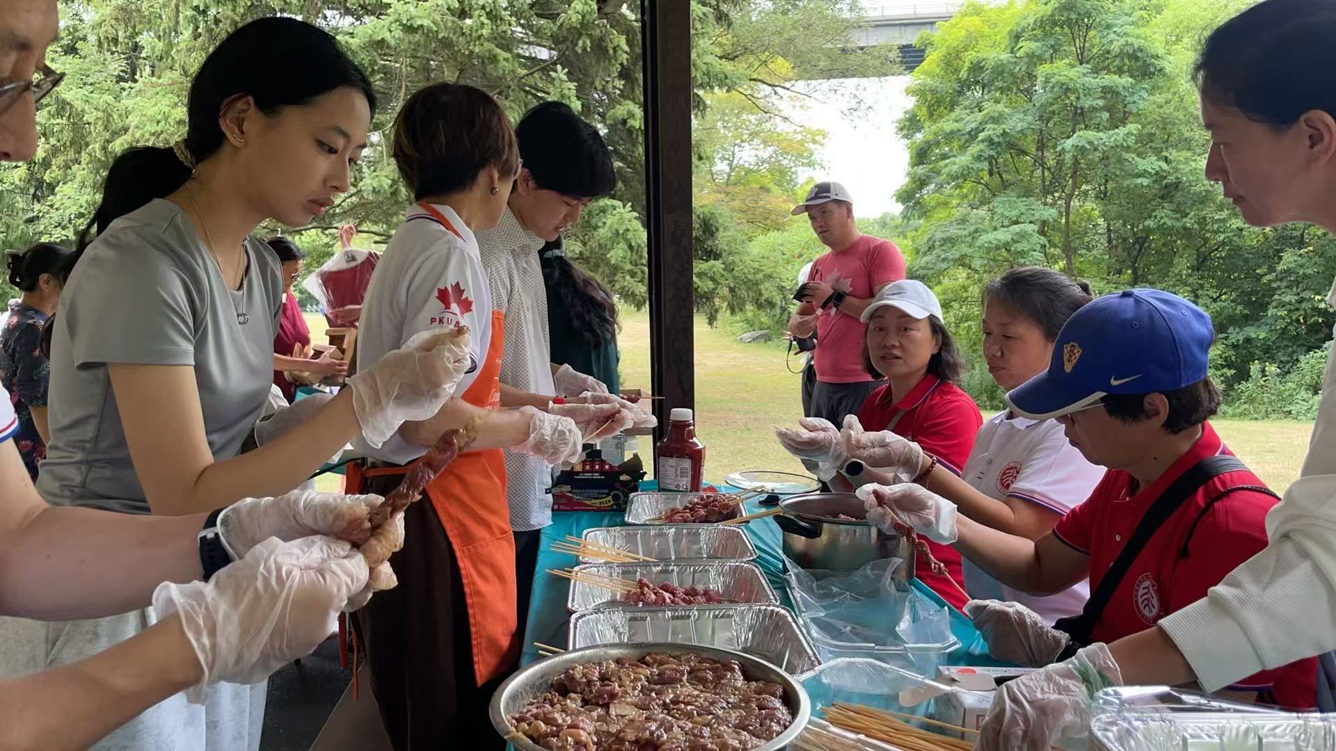 正午的阳光正好,会长王清山的致辞被一阵突如其来的雨声打断。”未名湖的雨跨越重洋追着我们到多伦多了!”一位校友大声笑道。雨滴在烤架上跳跃,蒸腾起带着肉香的水汽,将这场雨化作了一场别开生面的”调味”。不过片刻,雨过天晴,被洗涤过的空气中,炭火的焦香与青草的清新奇妙地交融,构成这个夏日最独特的记忆。